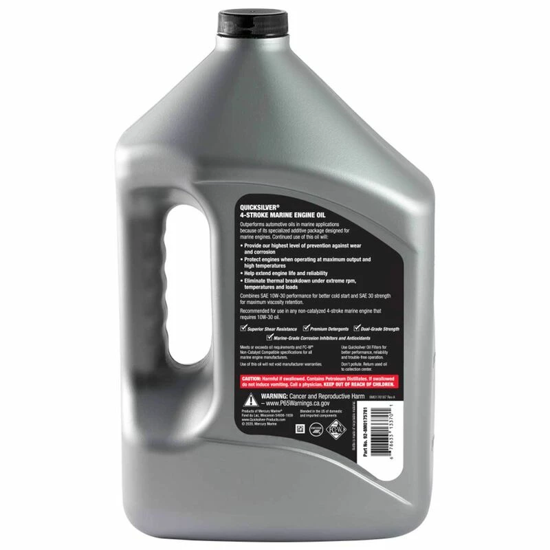 Advanced synthetic formula for maximum strength and viscosity retention. Over five years of engineering and development went into the unique and innovative formulation, which features a high-tech, advanced set of anti-wear additives for Quicksilver’s most superior engine protection in an SAE 10W30 engine oil. Designed to maintain engine reliability and performance, this oil has been proven to hold its viscosity ratings longer industry wear testing than other oils on the market.