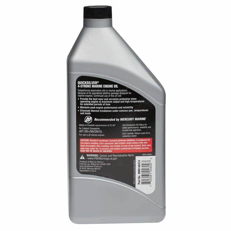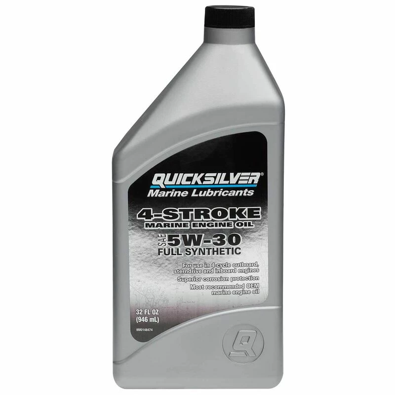 Full synthetic four stroke oil 8M0148474 is for use in all four stroke outboard, stern drive and inboard marine engines. SAE 5W30 weight oil provides outstanding wear and corrosion protection to help extend engine life. It maintains its viscosity, protects against varnish buildup and sludge formation and exceeds the rust protection requirements for NMMA certification.